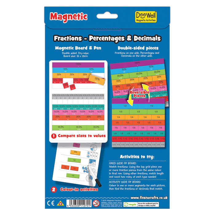 It's reversible - turn to learn! Erasable pen, backing board and 51 magnetic pieces to teach percentages and decimals. On one side a fraction is listed, flip the piece and the other side has it's equivalent percentage.