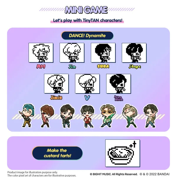 - The food which you give to TinyTAN characters are each character’s favorite food! Two mini-games are included to play with the TinyTAN characters: Dance to “Dynamite” and make custard tarts.